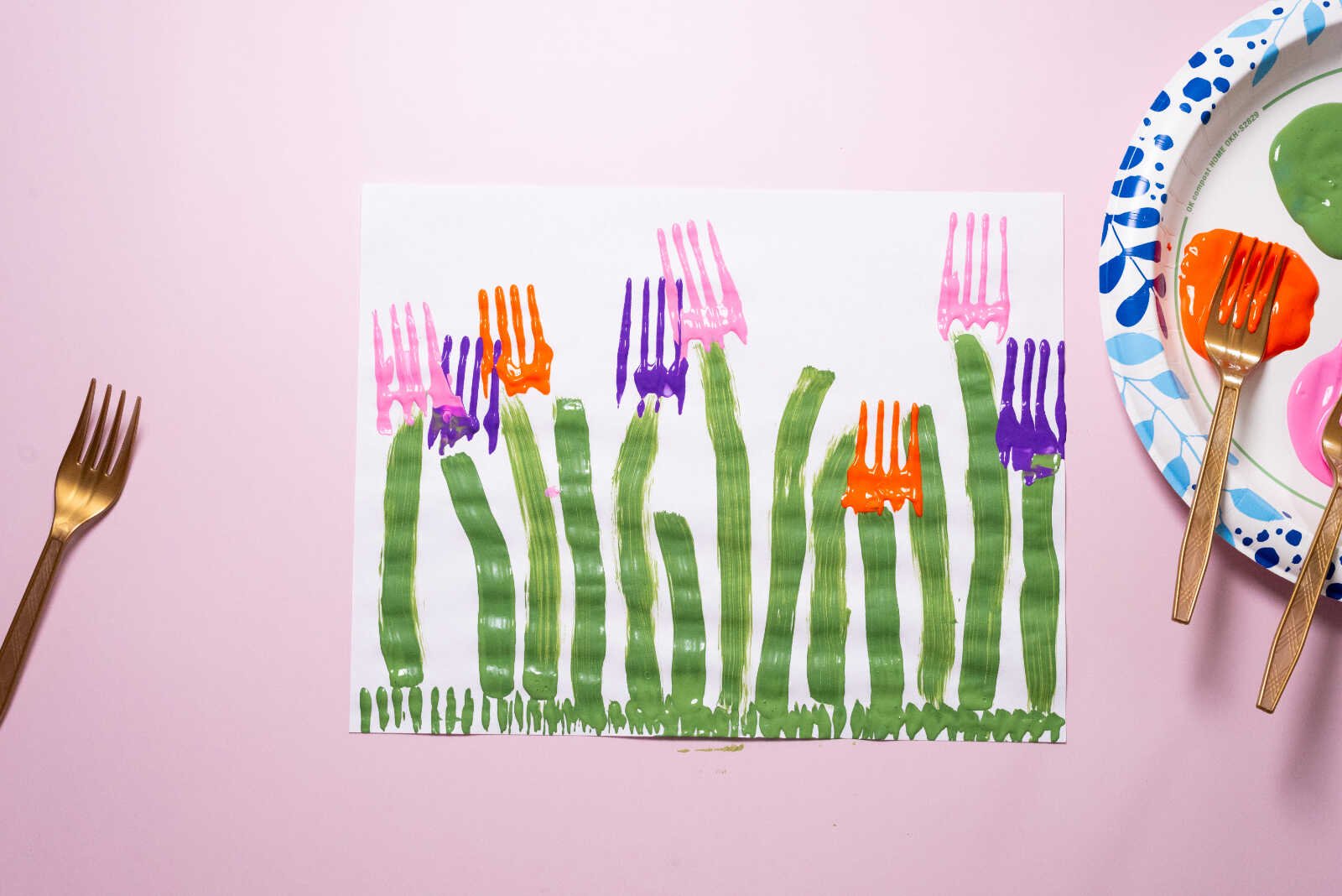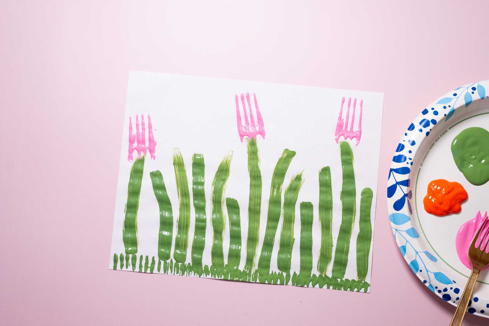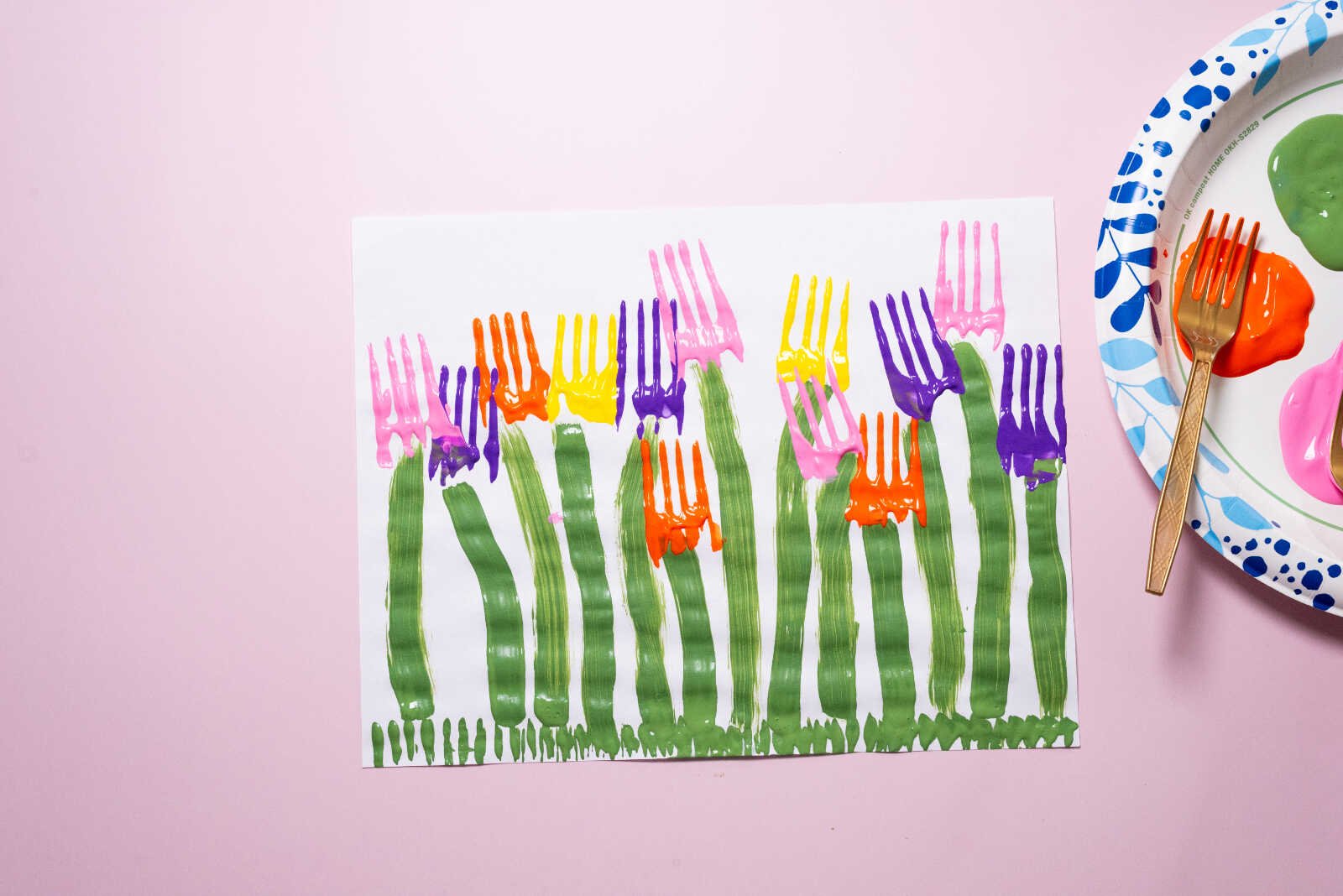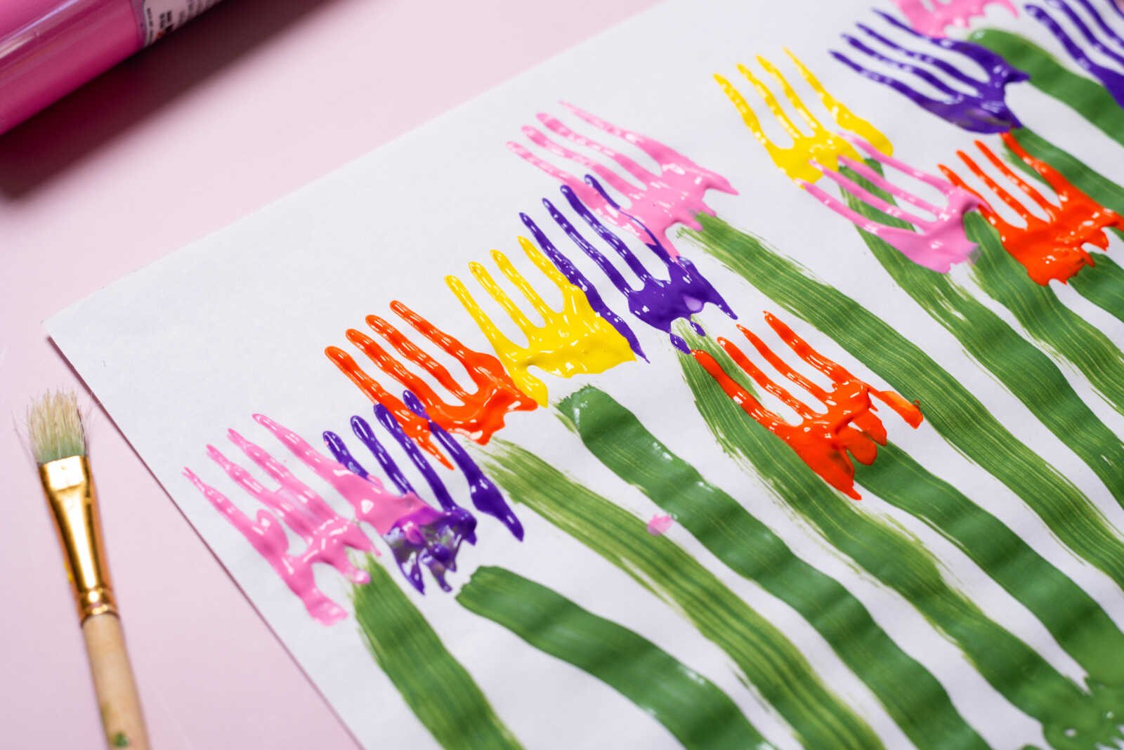 Align the fork at the top of each painted stem. Press it firmly onto the paper, then give it a slight rocking motion toward the handle to create that rounded tulip shape.