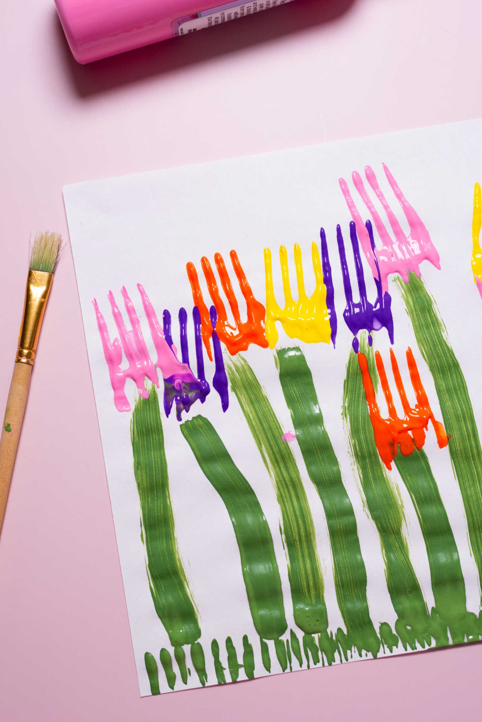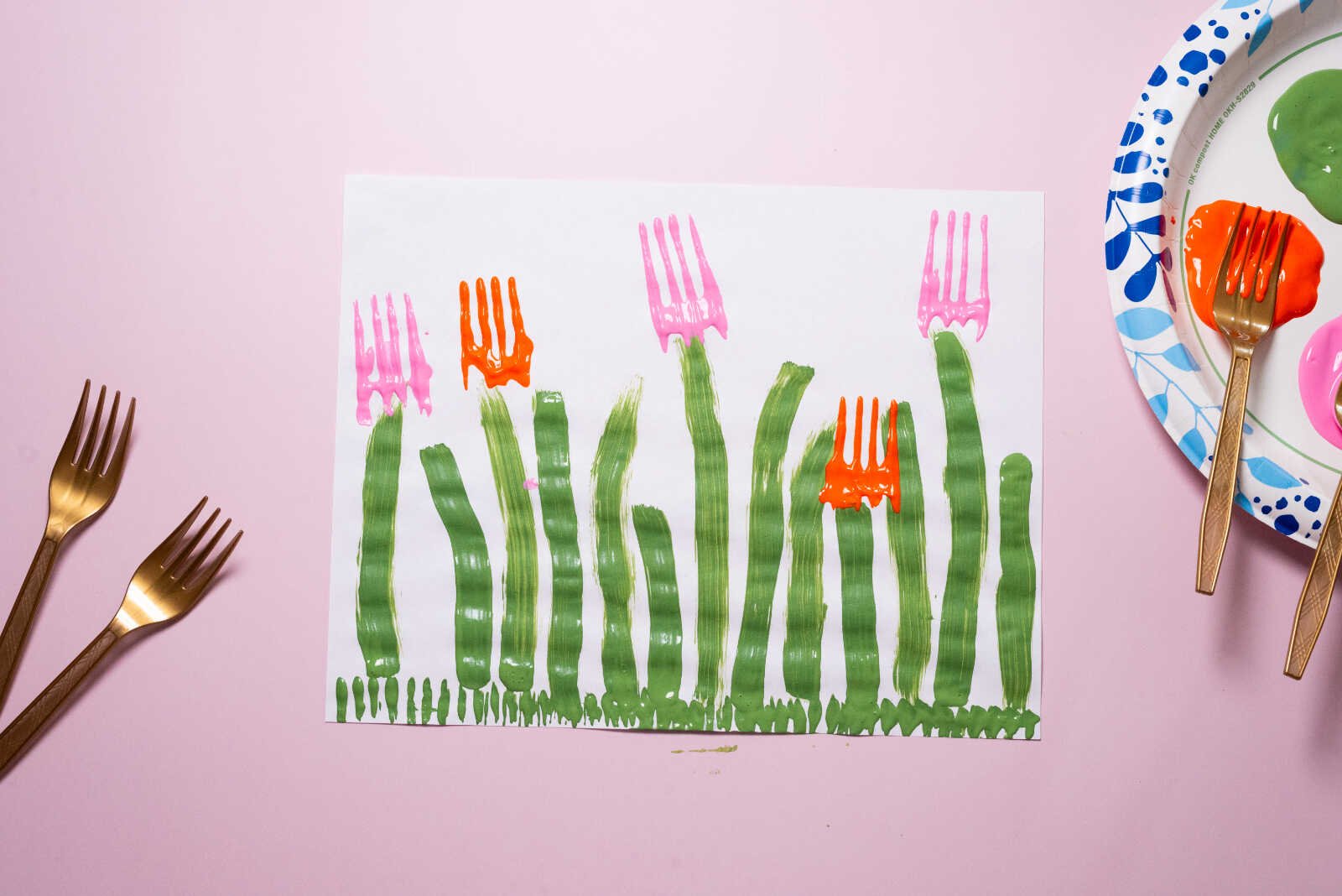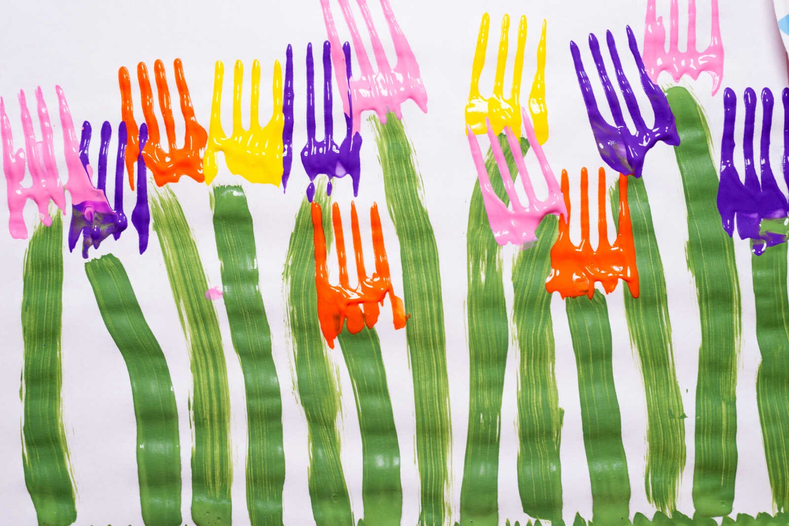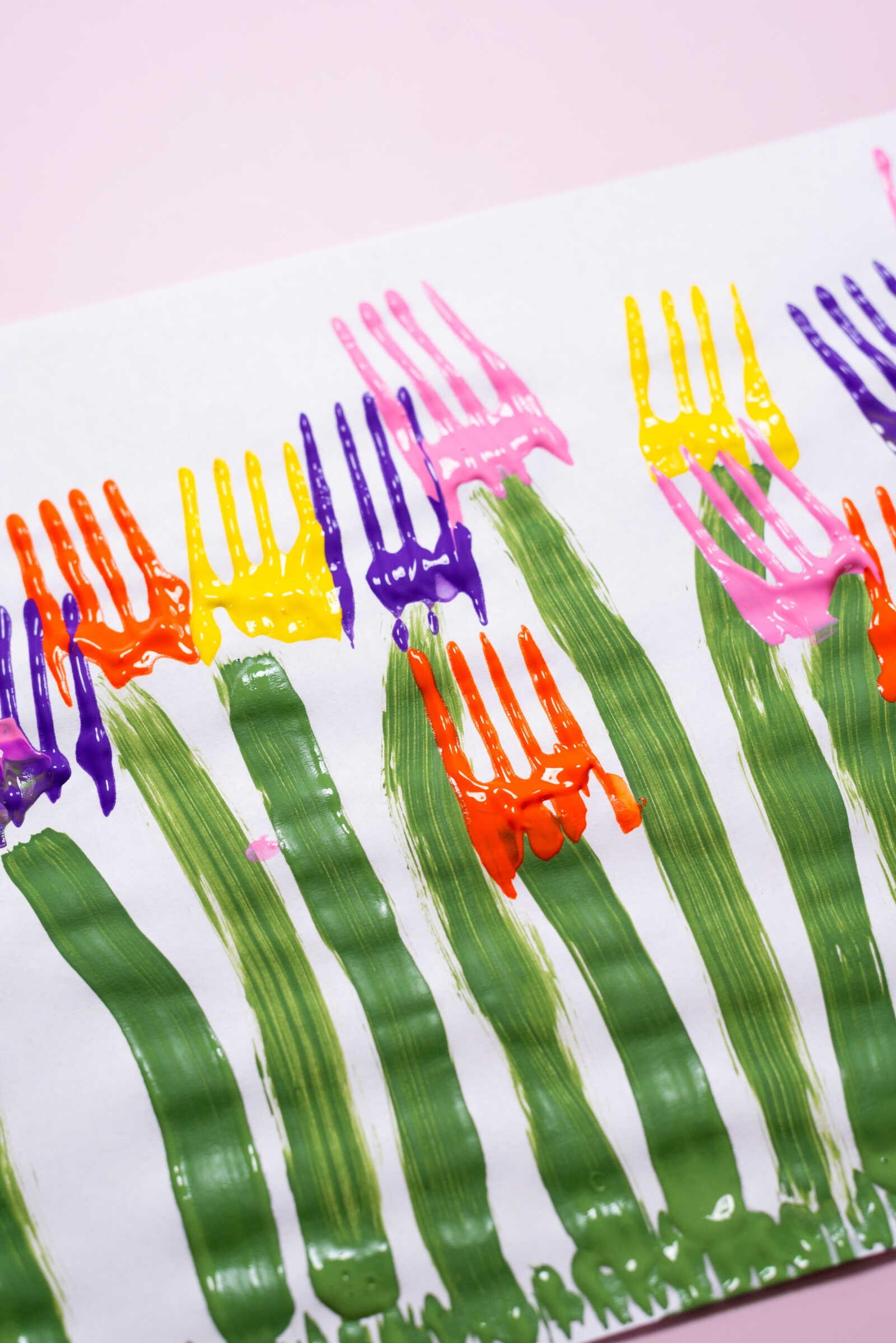 Align the fork at the top of each painted stem. Press it firmly onto the paper, then give it a slight rocking motion toward the handle to create that rounded tulip shape.