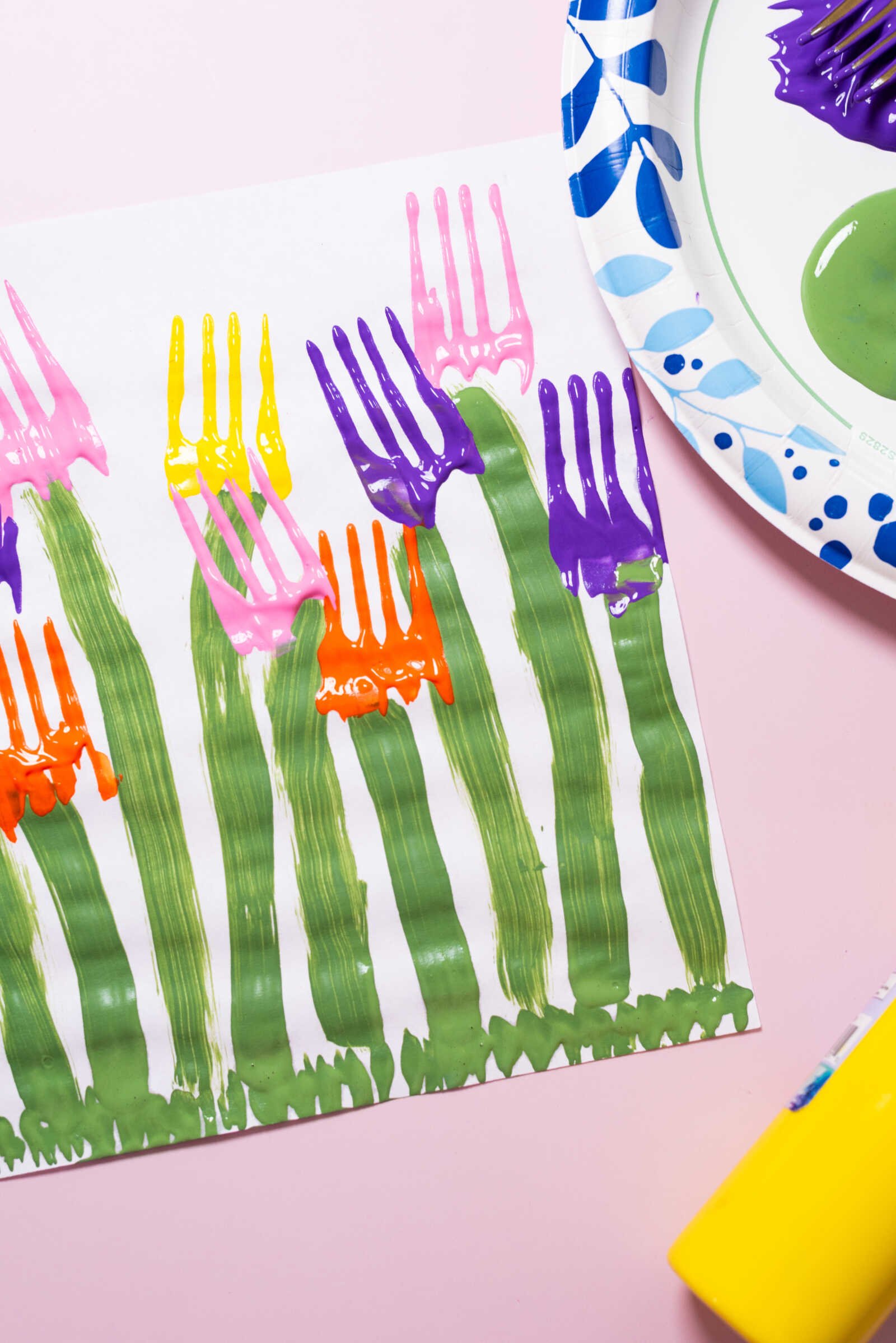 Take a clean fork and dip the back side into your chosen tulip color (pink, purple, red, or yellow).