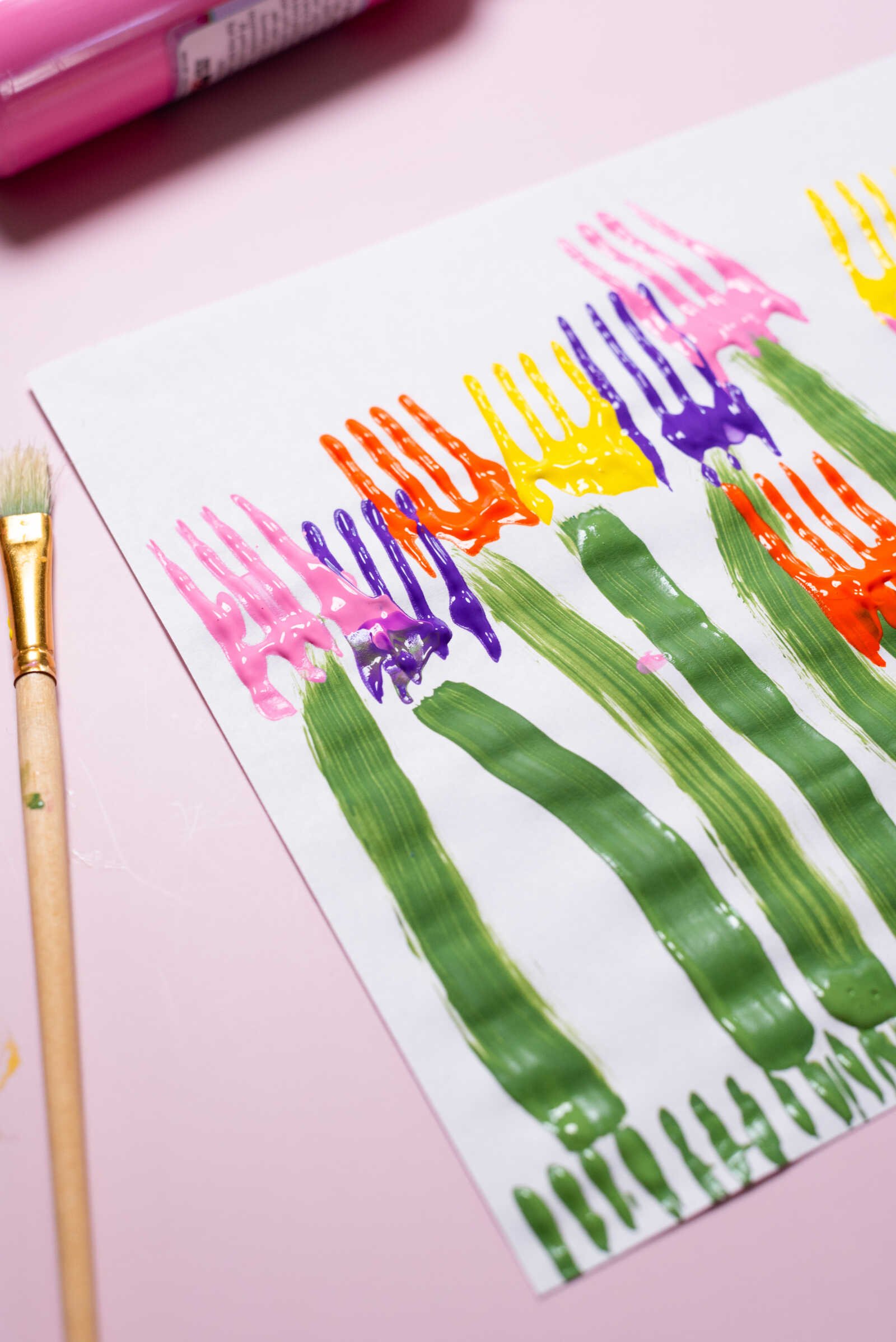 Painting green stems for fork-stamped tulips kids craft using a brush on white paper.