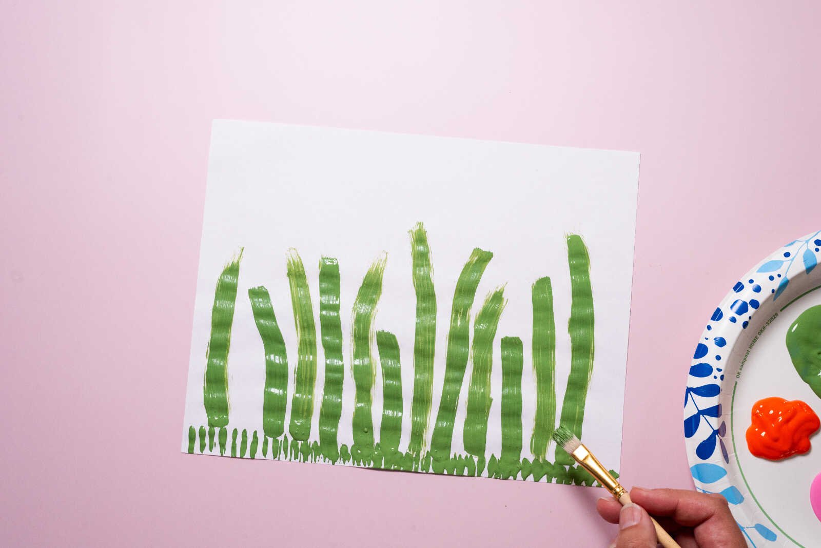 Using a paintbrush and green paint, draw thin vertical lines extending upward from the grass. These will become your tulip stems.