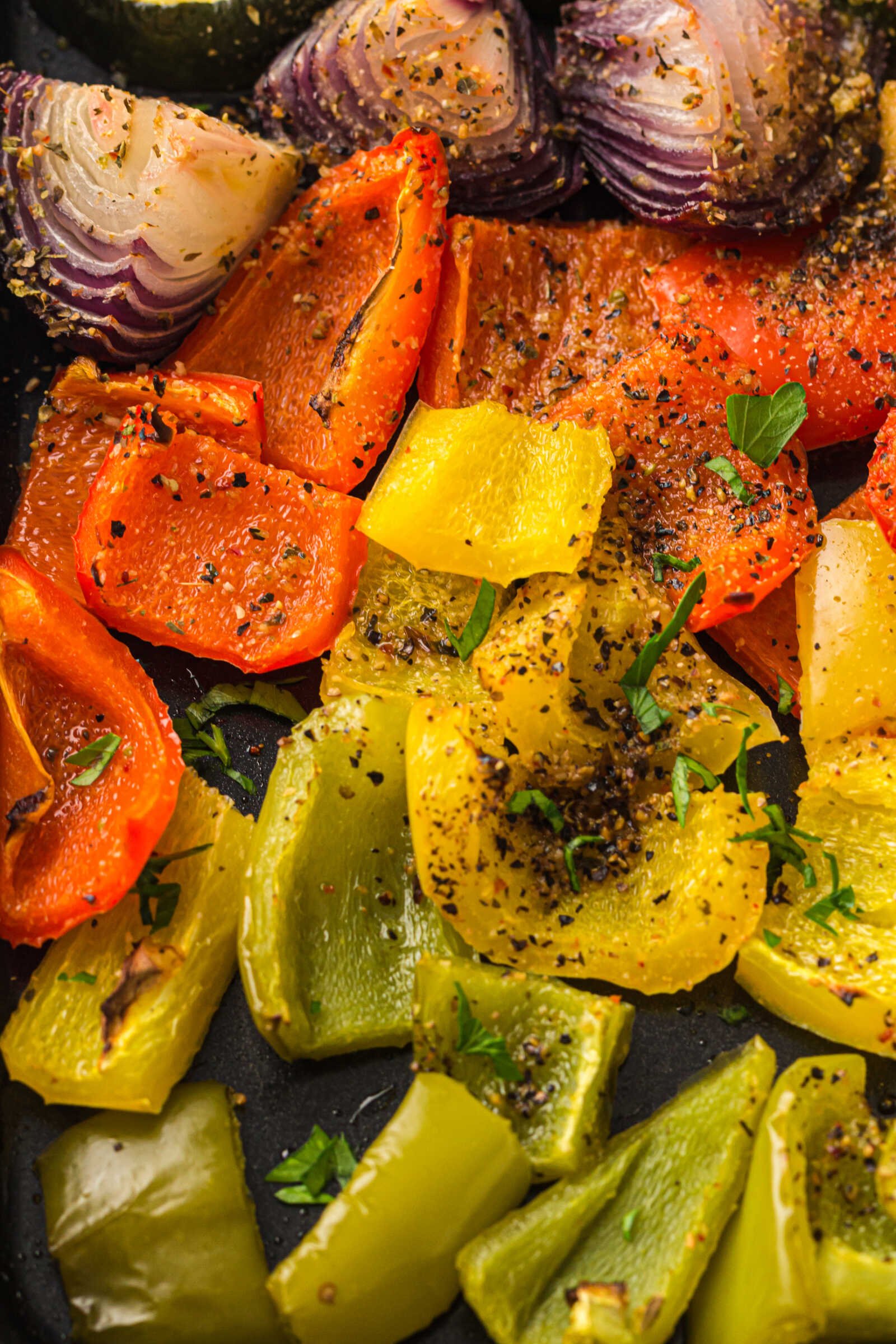 - The vegetables are tender with golden, caramelized edges