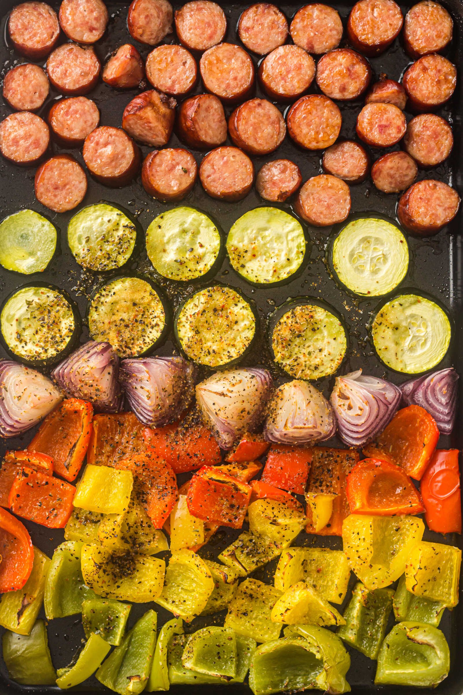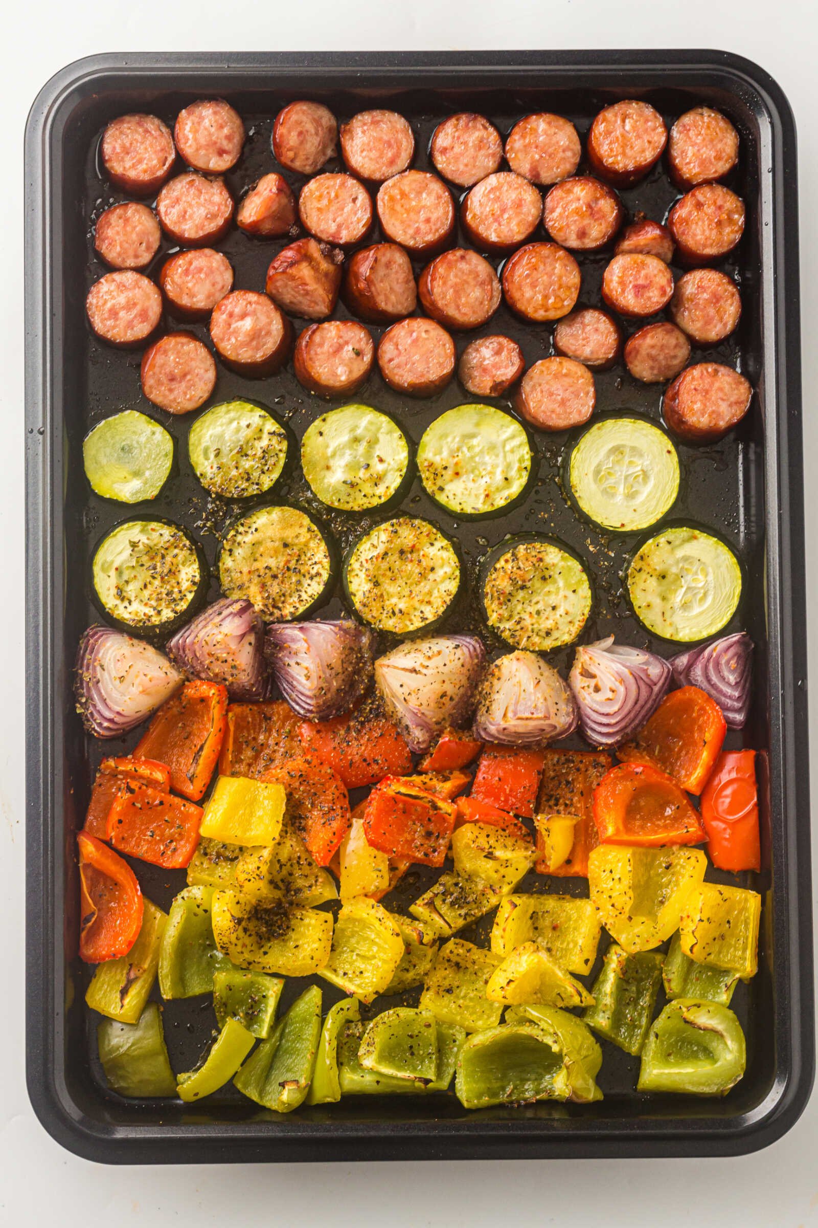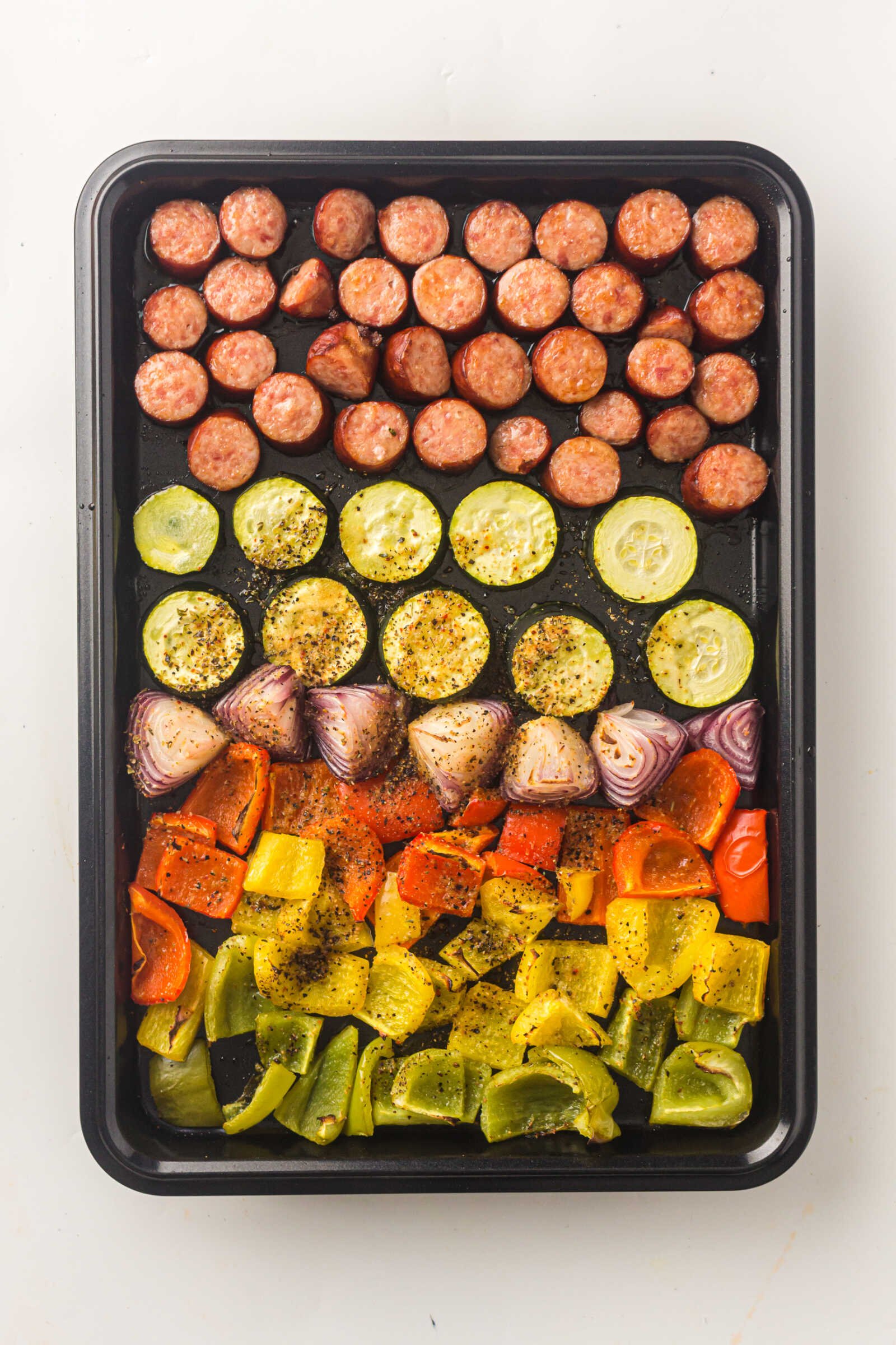 Place the sliced sausage onto the sheet pan, spacing it evenly among the vegetables. Tuck pieces between veggies to ensure even browning.