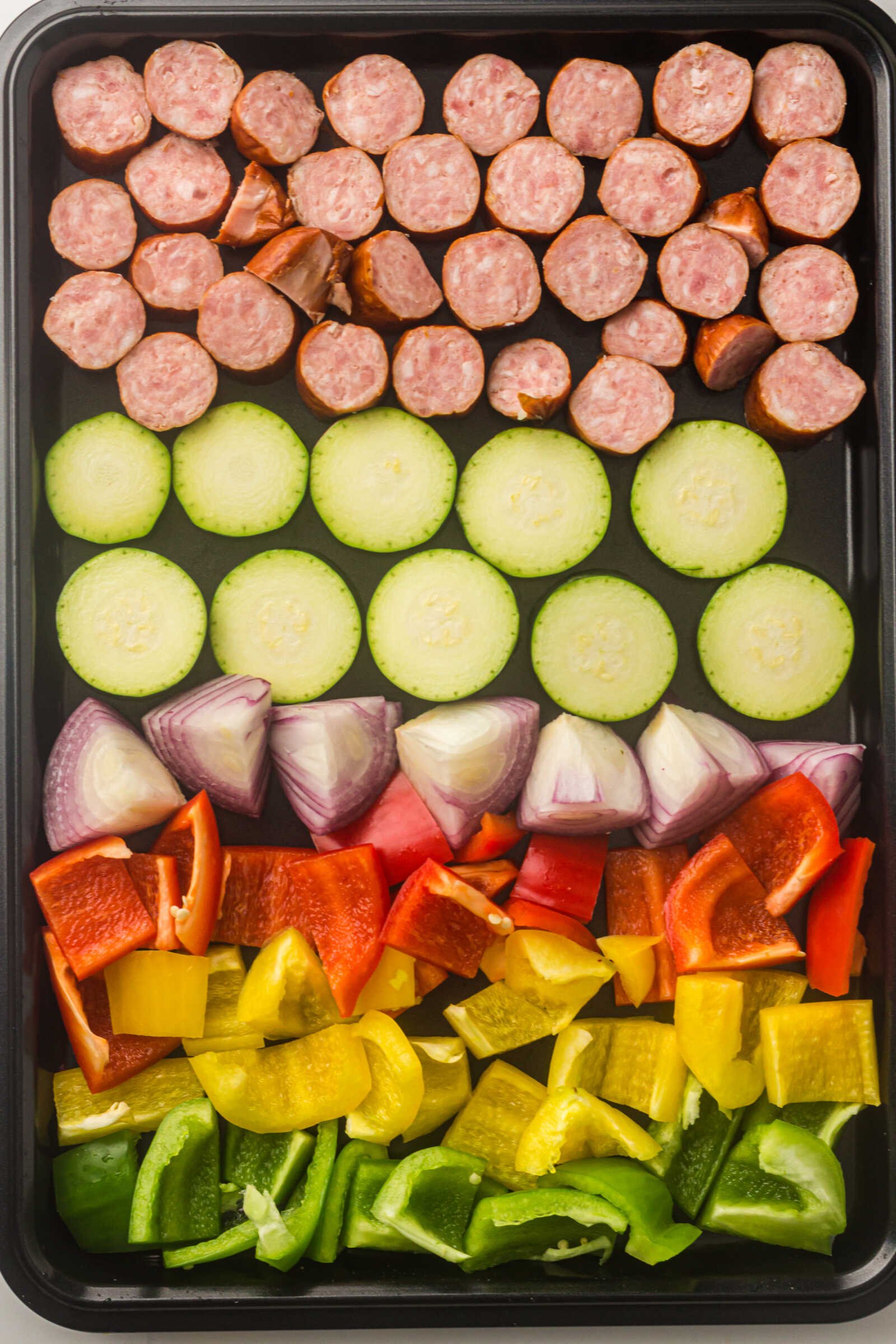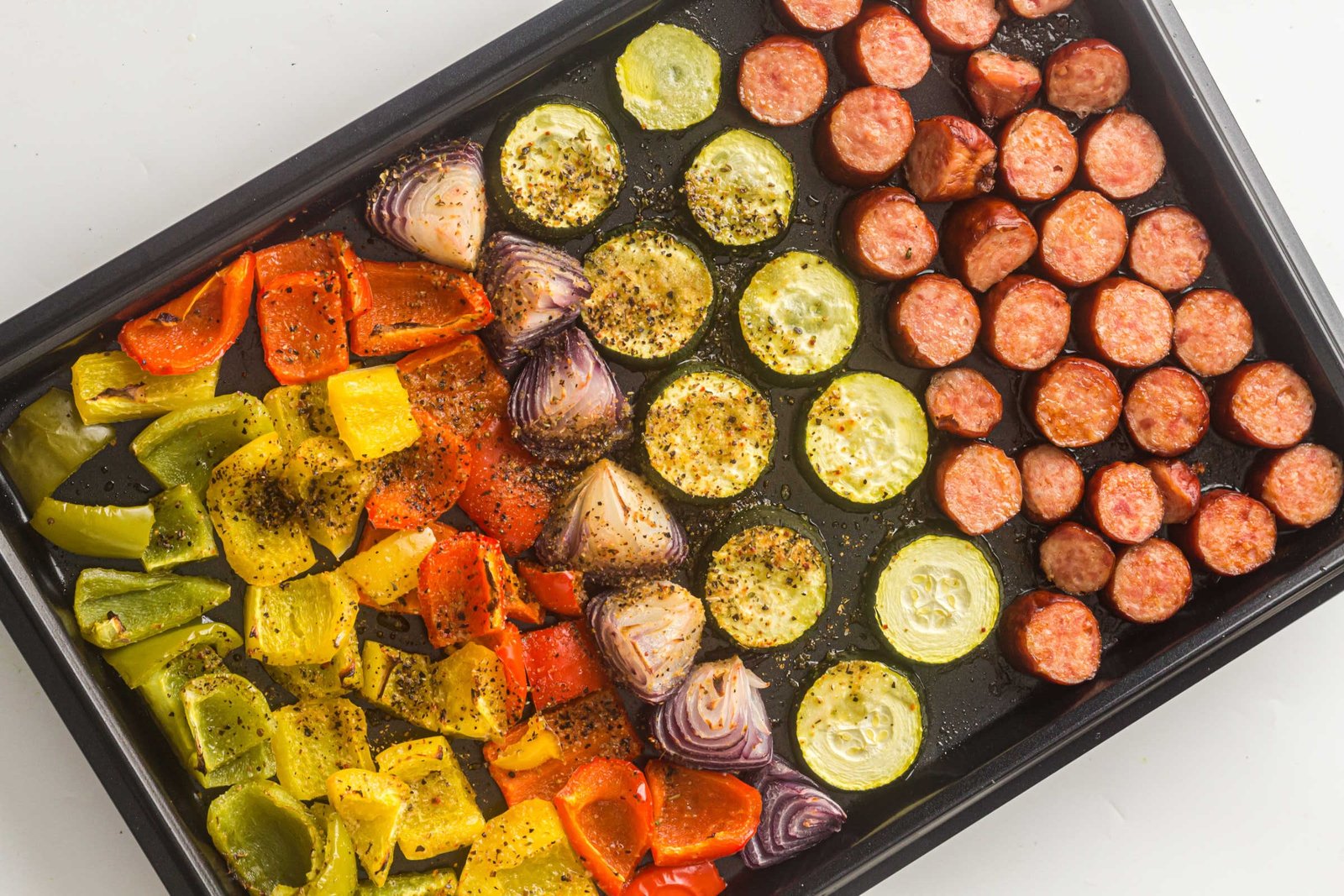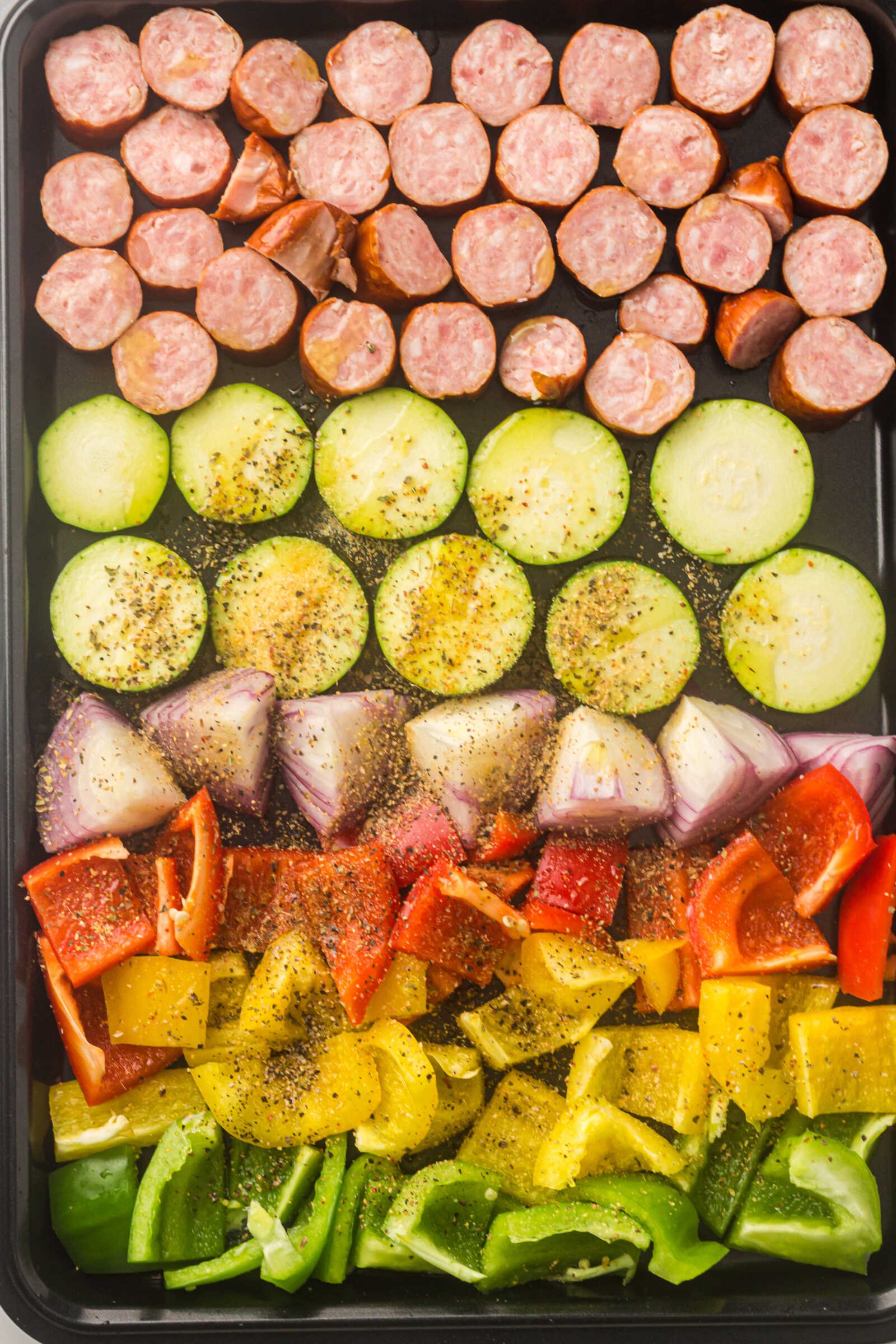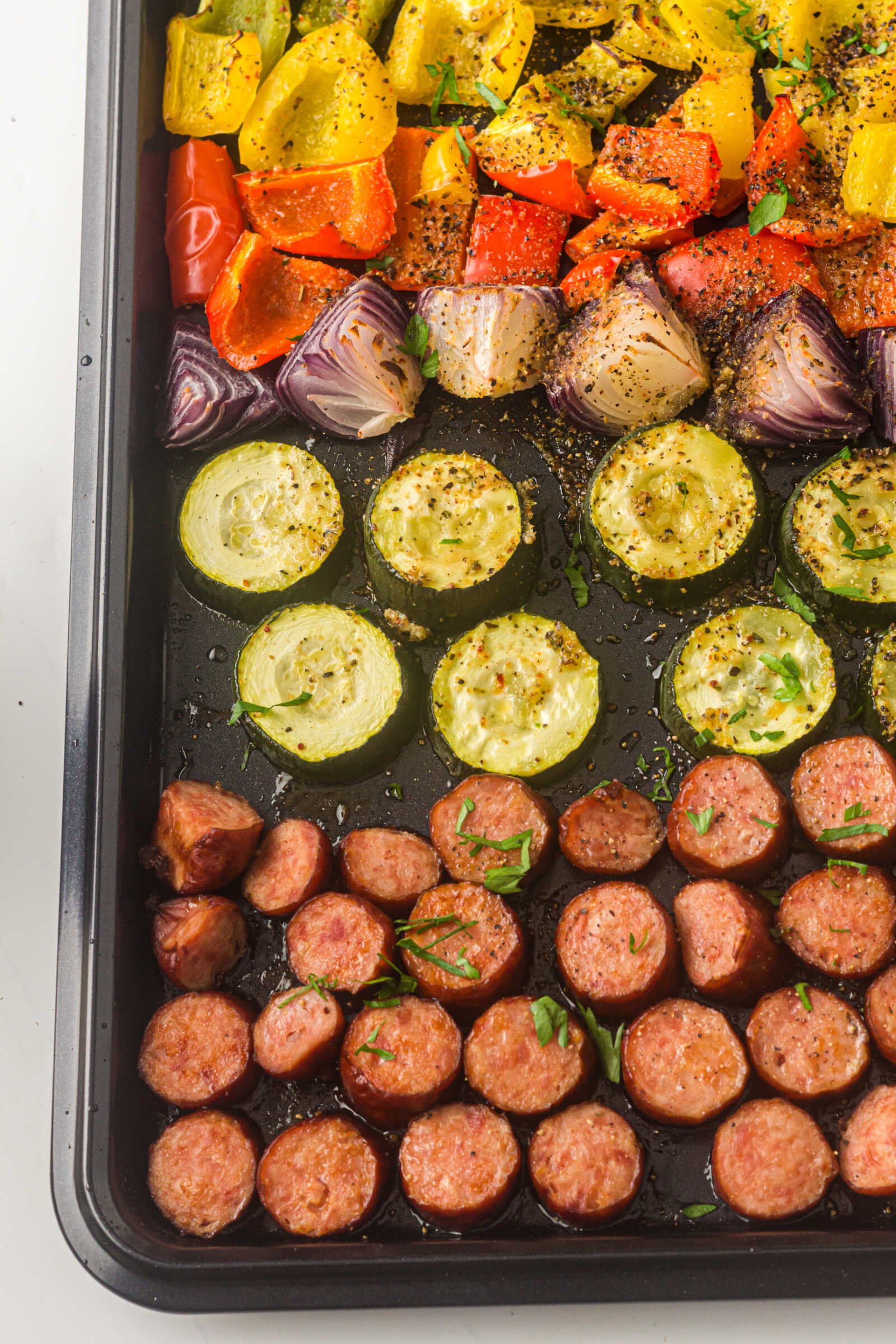 Place the sliced sausage onto the sheet pan, spacing it evenly among the vegetables. Tuck pieces between veggies to ensure even browning.