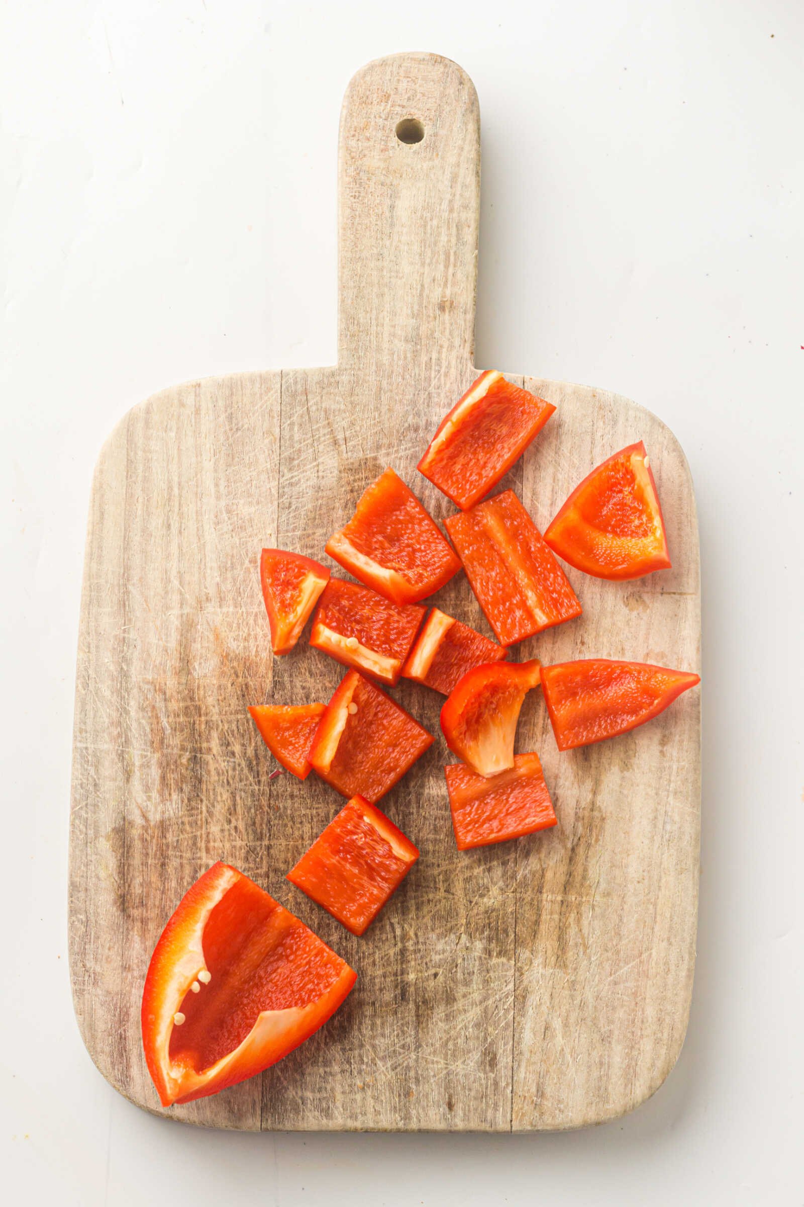 - Chop the bell peppers into bite-sized pieces